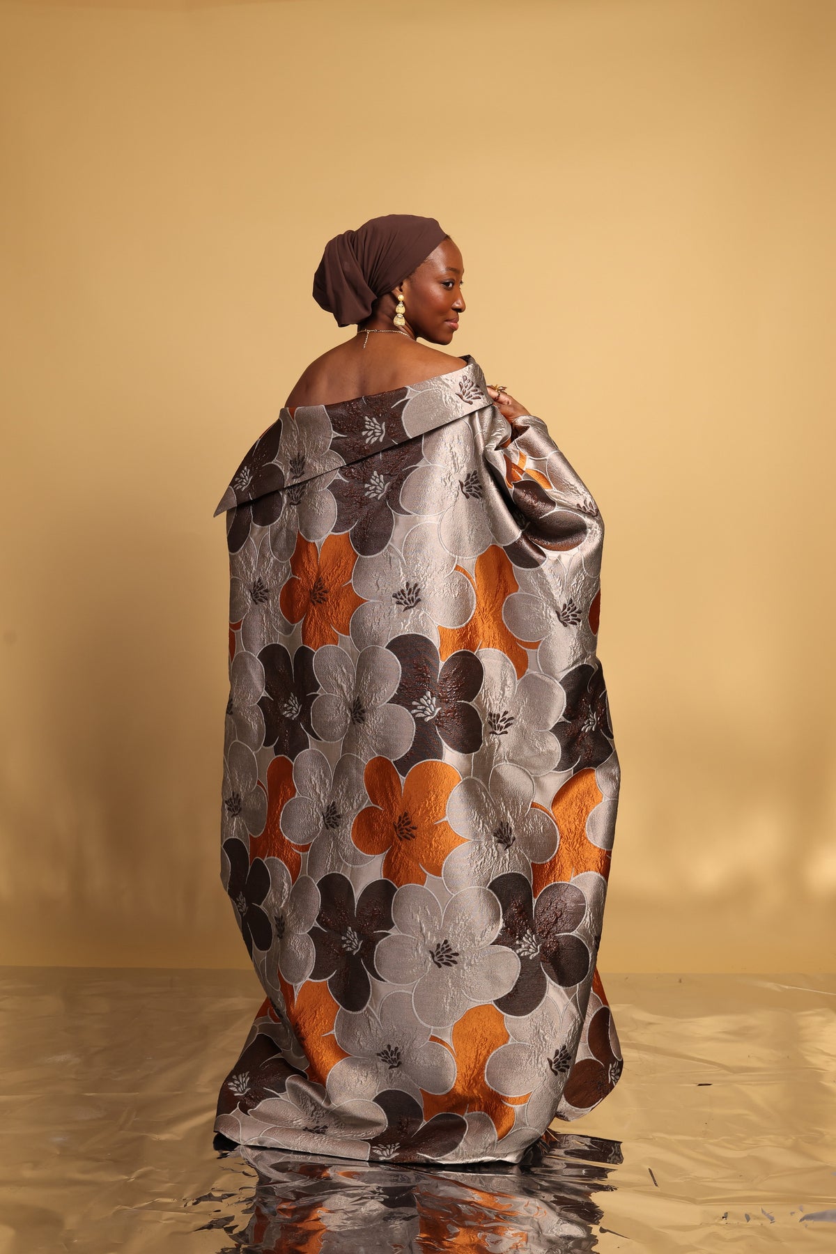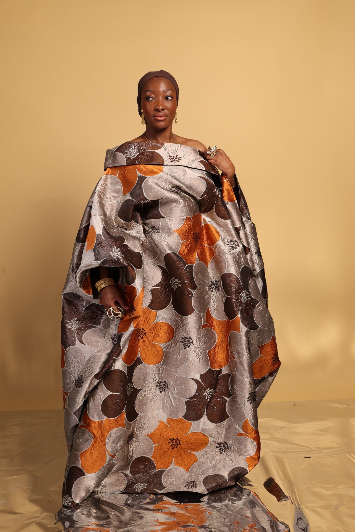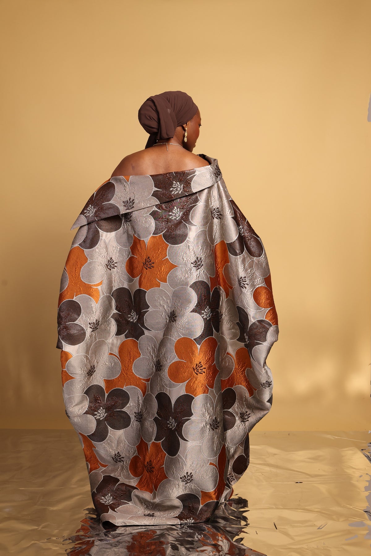 This luxury Bubu is a striking blend of refined elegance and bold design. Featuring a dramatic wild boat neckline with an oversized asymmetrical collar, the silhouette creates effortless movement and regal presence. An internal adjustable waist string allows for a softly snatched fit while maintaining a graceful drape.