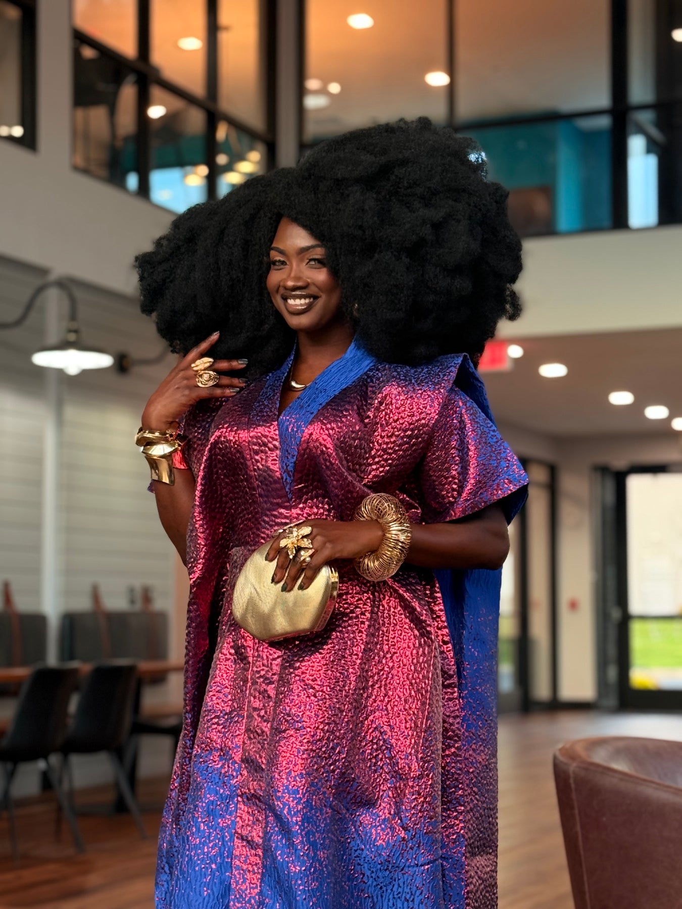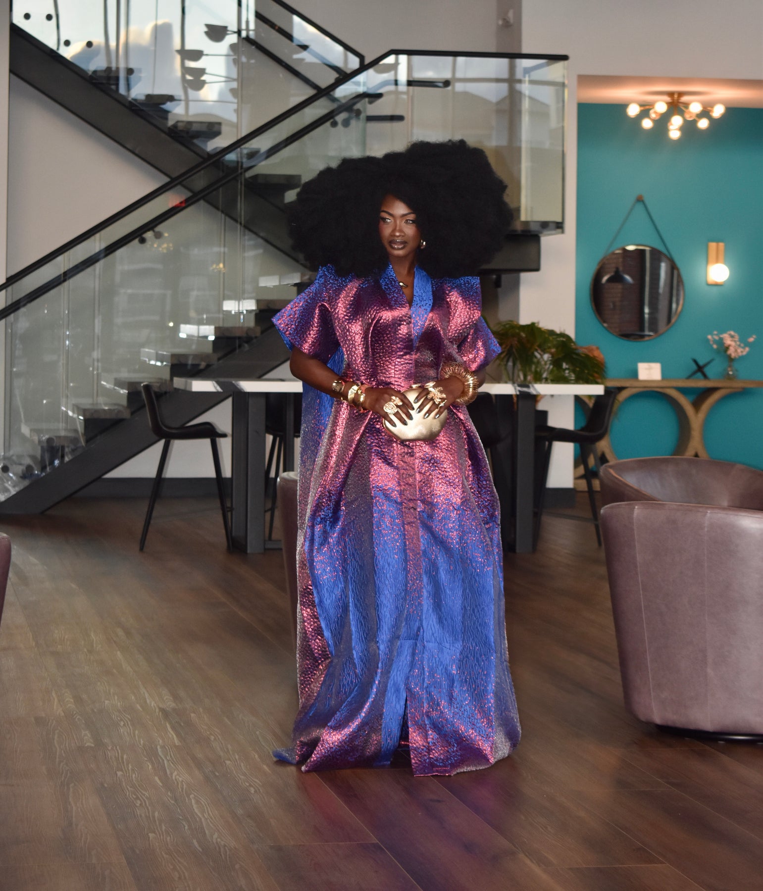 Step into bold African elegance with this stunning Pink & Royal Blue Brocade Bubu. Crafted from rich, high-quality brocade, the fabric features a textured shimmer that shifts beautifully between deep pink and royal blue as you move.