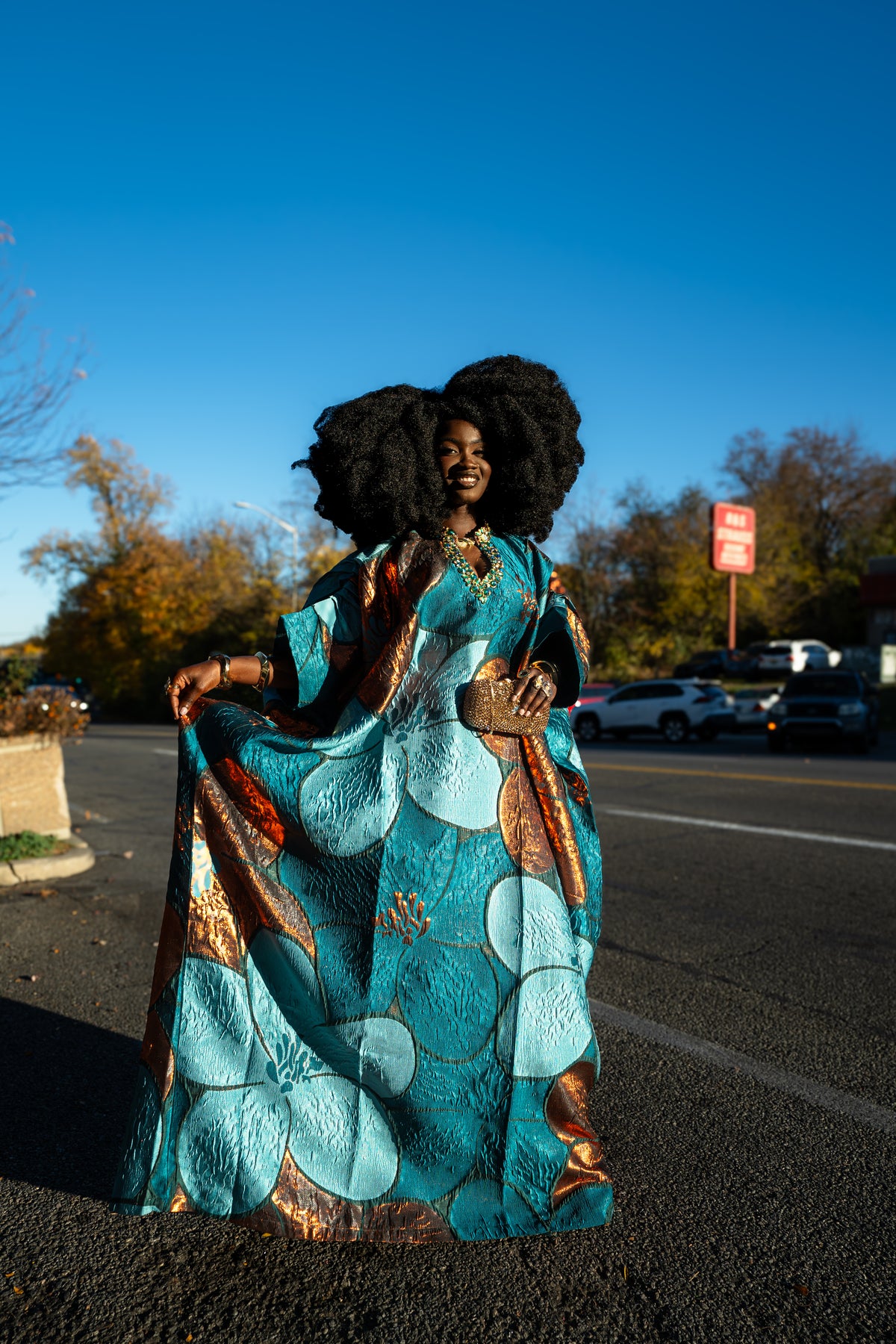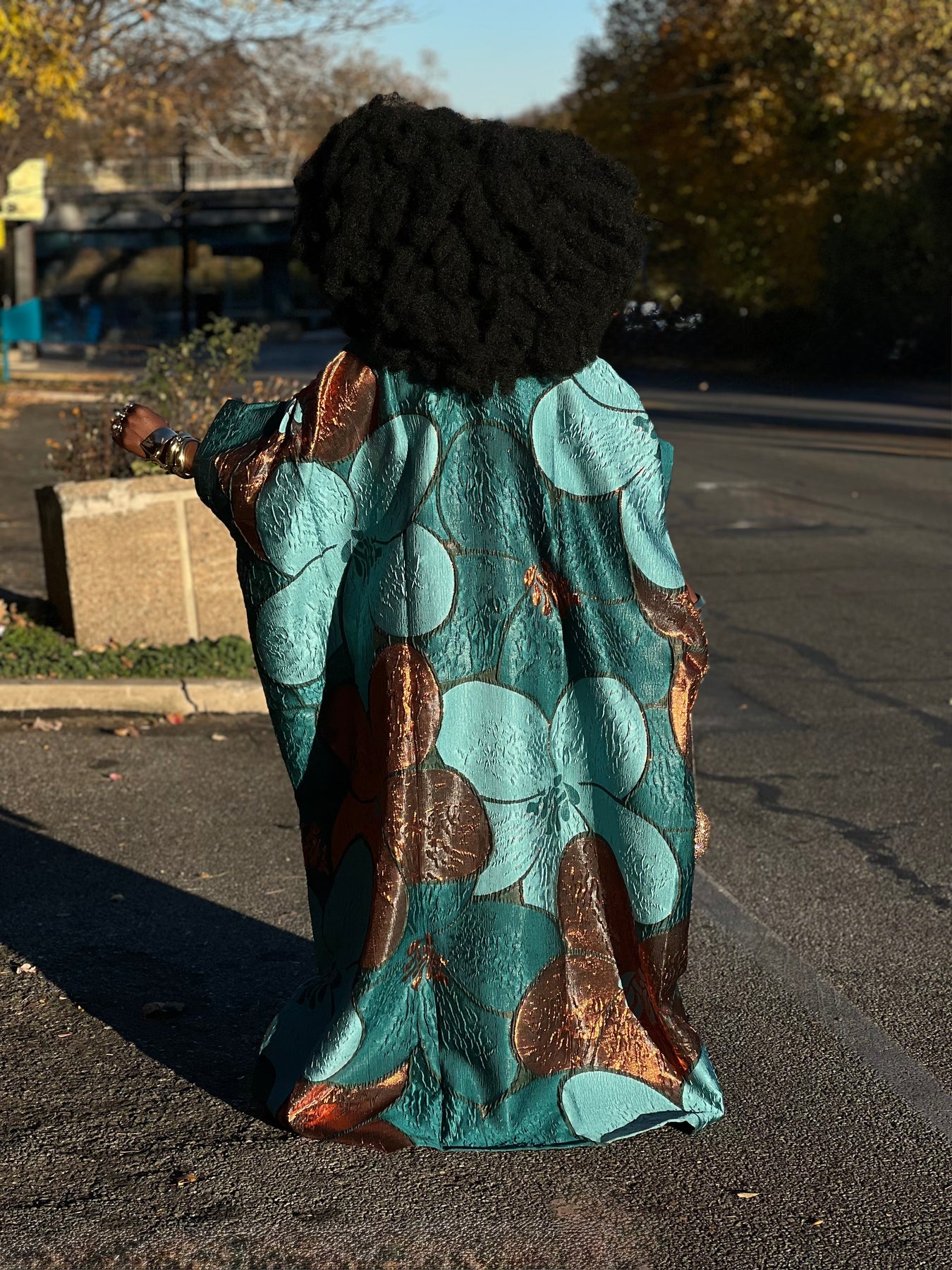 Turn heads effortlessly in this teal and bronze boubou from Kdkollections. Designed with soft, high-quality brocade and shimmering metallic patterns, it features a hidden rope inside to snatch your waist and accentuate your curves — combining comfort, elegance, and cultural pride.