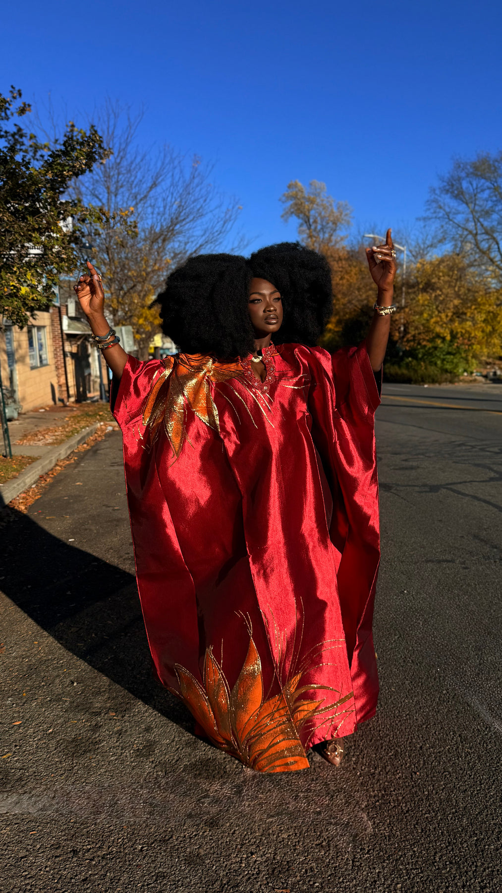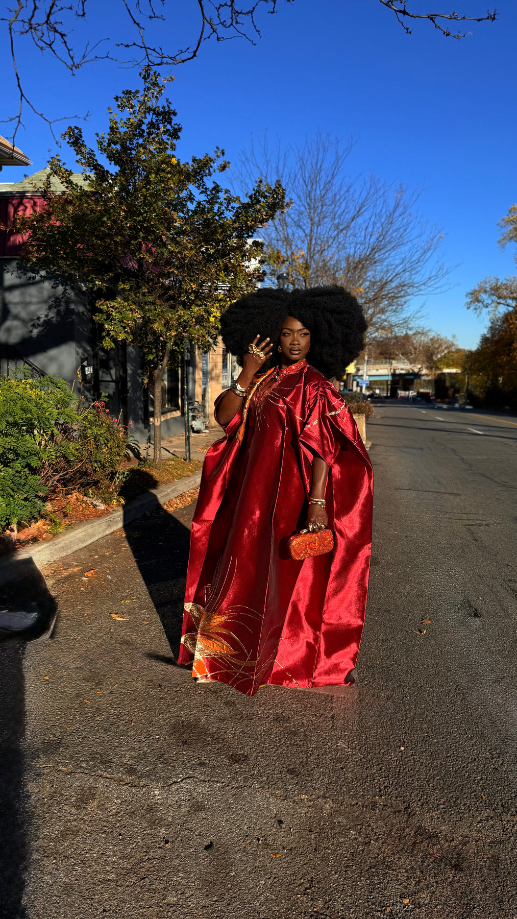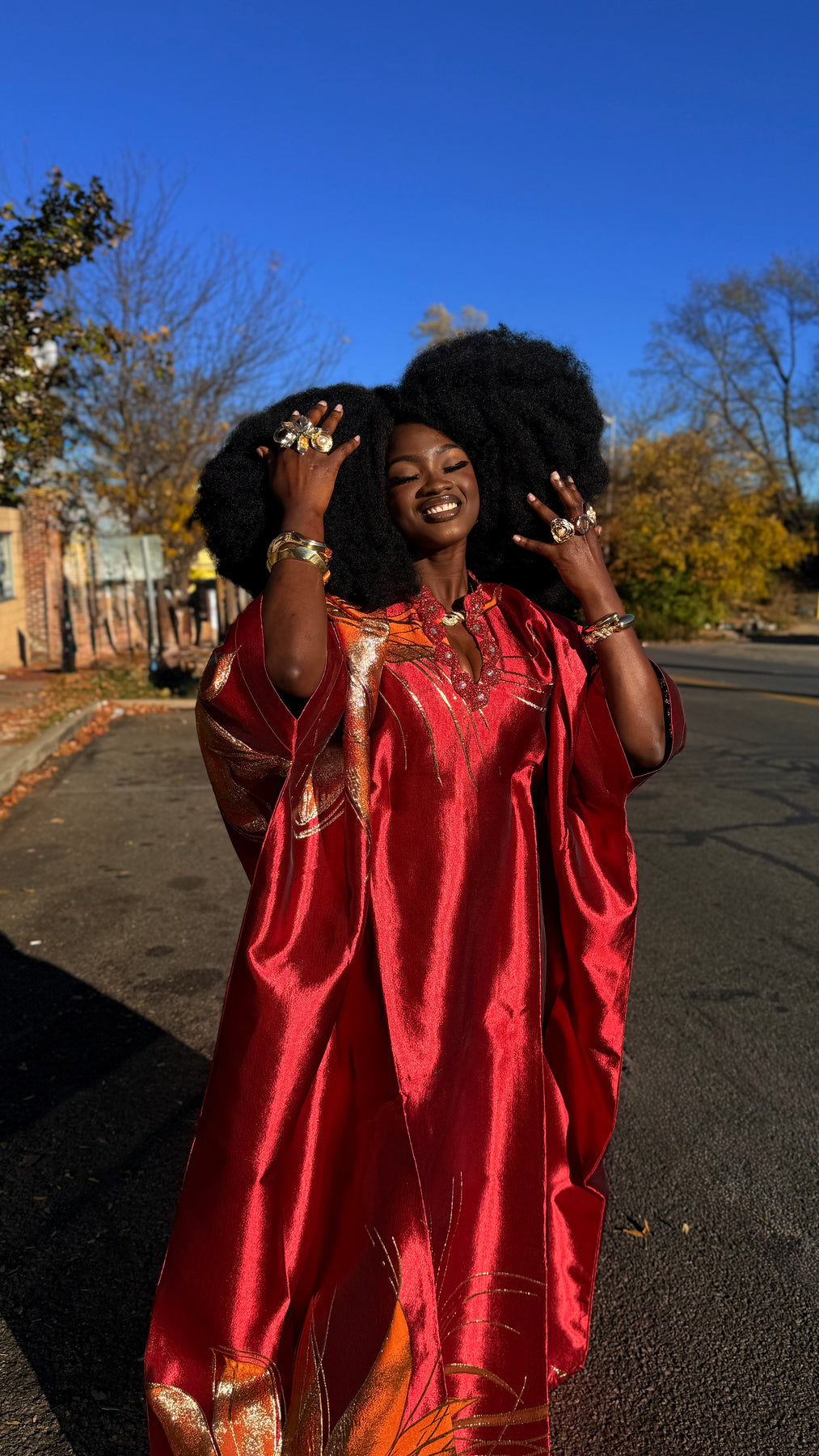 The Crimson Majesty Boubou from KDKOLLECTIONS is a statement of royal grace and feminine strength. Crafted from rich, luminous brocade in shades of deep crimson and metallic gold, this piece captures light like fire on silk — glowing with every movement.