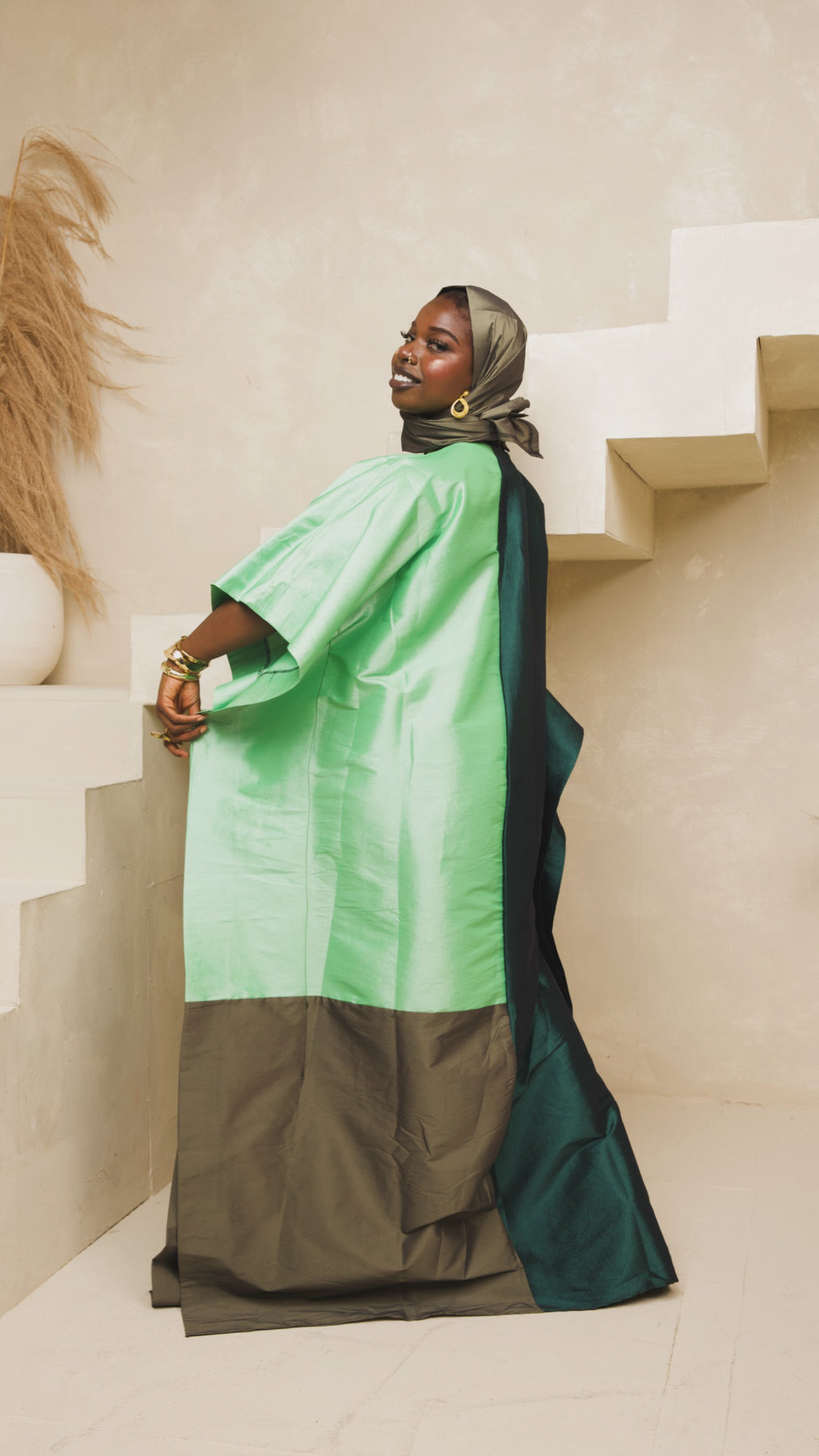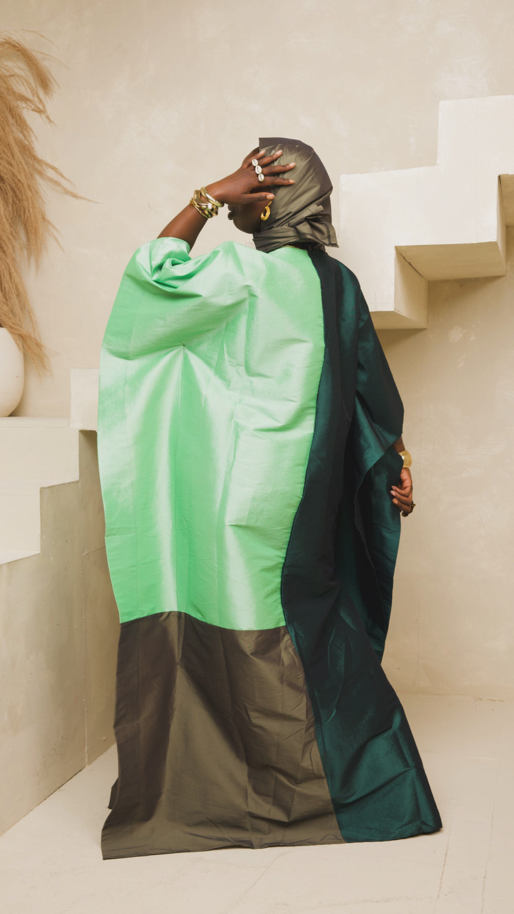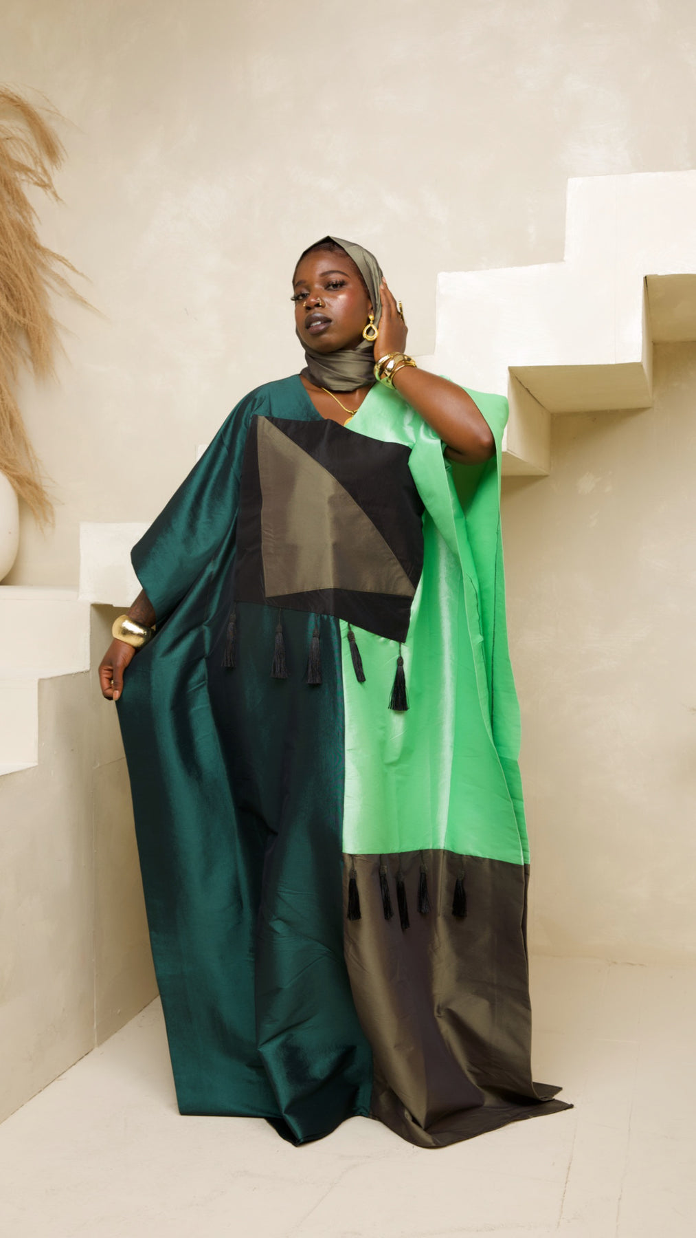 The striking color-block palettes of all shades of Green💚 creates a modern yet timeless design, accentuated by the geometric front panel with delicate black tassel embellishments. Its oversized silhouette and wide draped sleeves offer ultimate comfort while keeping the look undeniably regal.