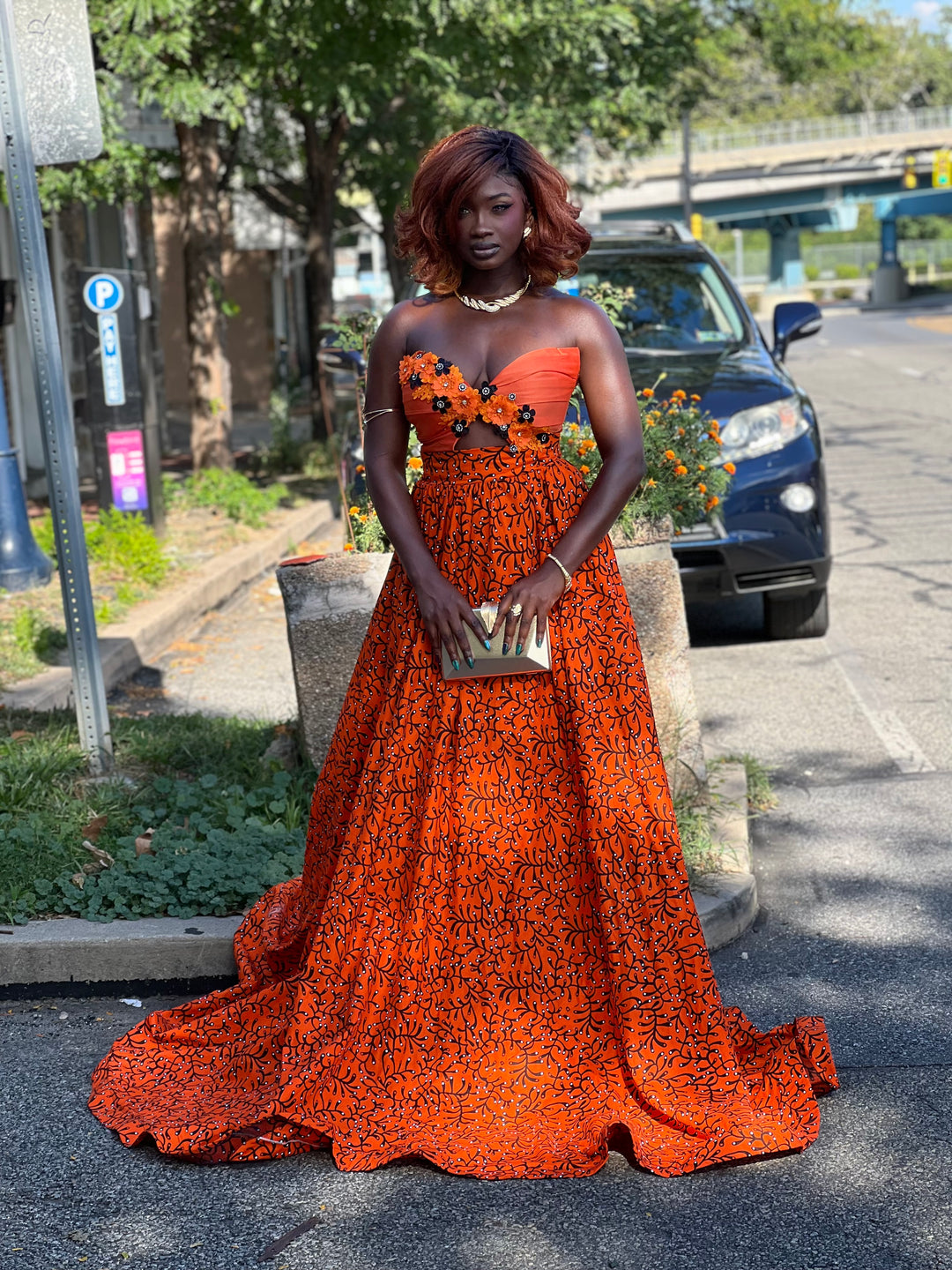 African print corset long maxi dress with tie on spaghetti sleeves.