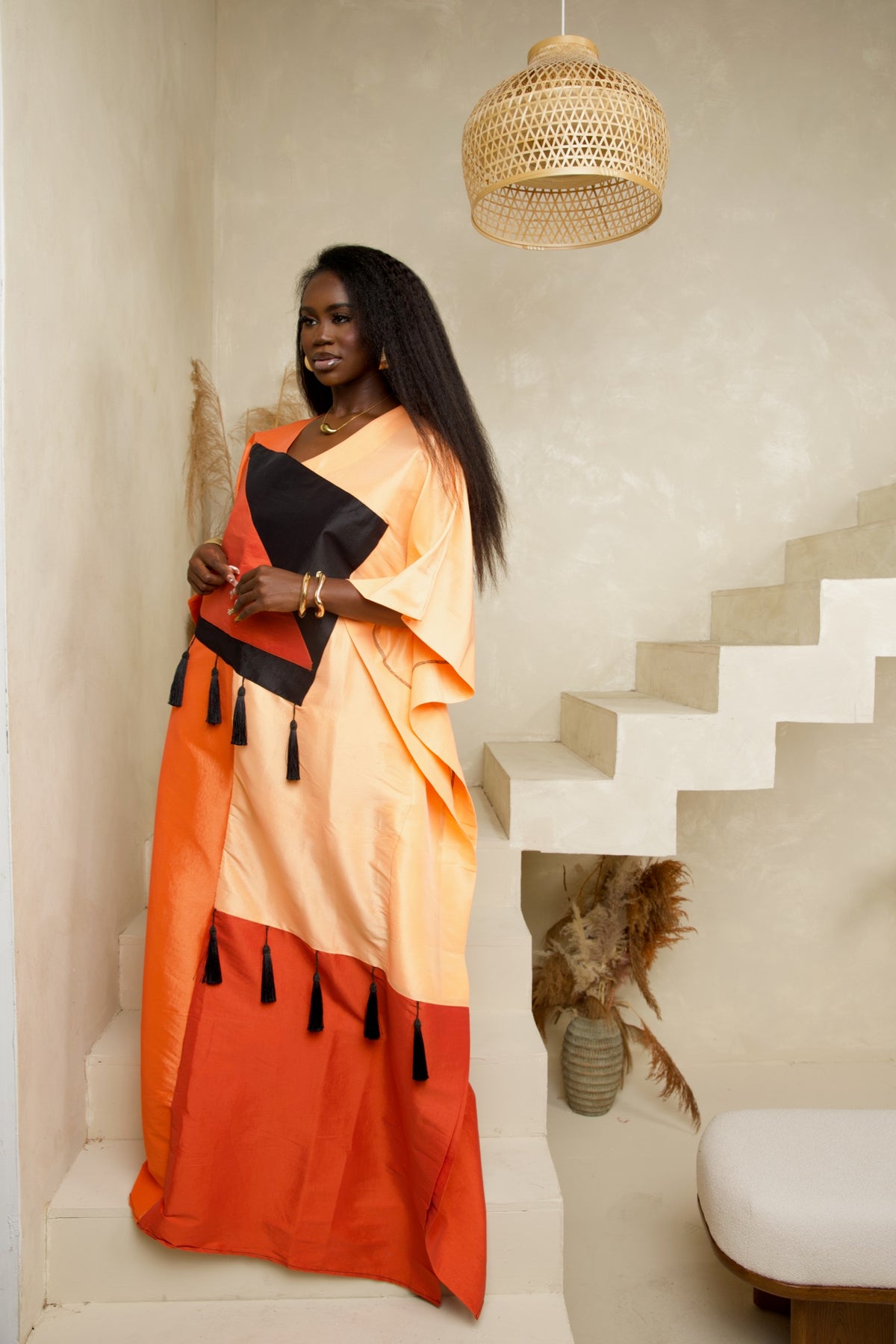 The striking color-block palettes of all shades of orange 🍊 creates a modern yet timeless design, accentuated by the geometric front panel with delicate black tassel embellishments. Its oversized silhouette and wide draped sleeves offer ultimate comfort while keeping the look undeniably regal.