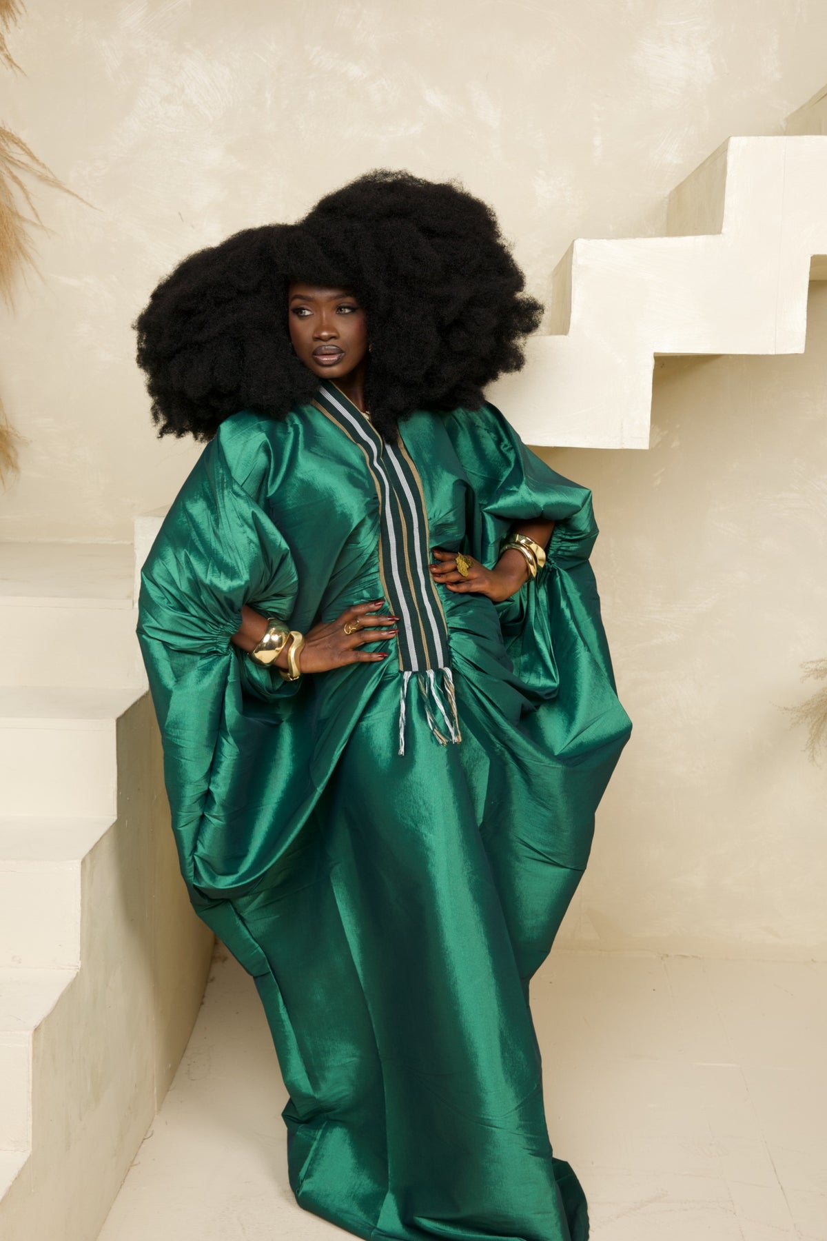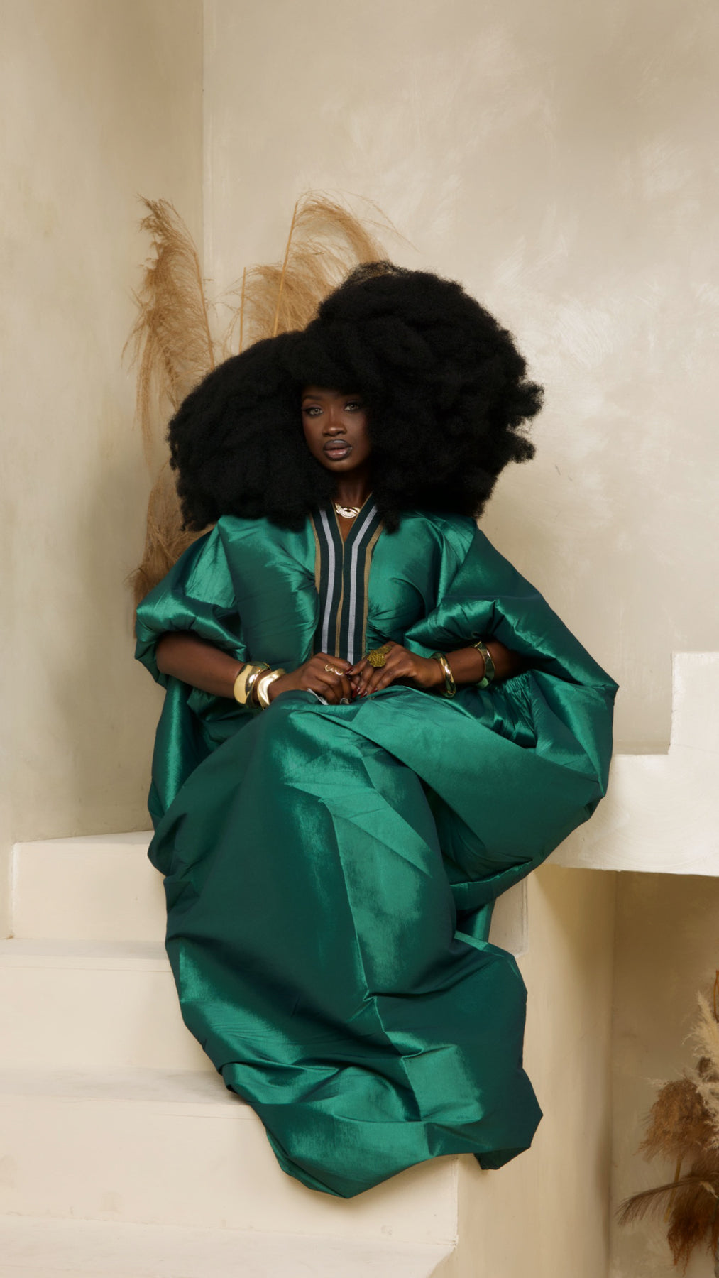 Elevate your wardrobe with this elegant Green💚Taffeta Bubu Gown with Headwrap. Made from premium taffeta, this gown drapes effortlessly, offering both comfort and sophistication. The luxurious fabric has a subtle sheen that catches the light beautifully, making it perfect for any special occasion.