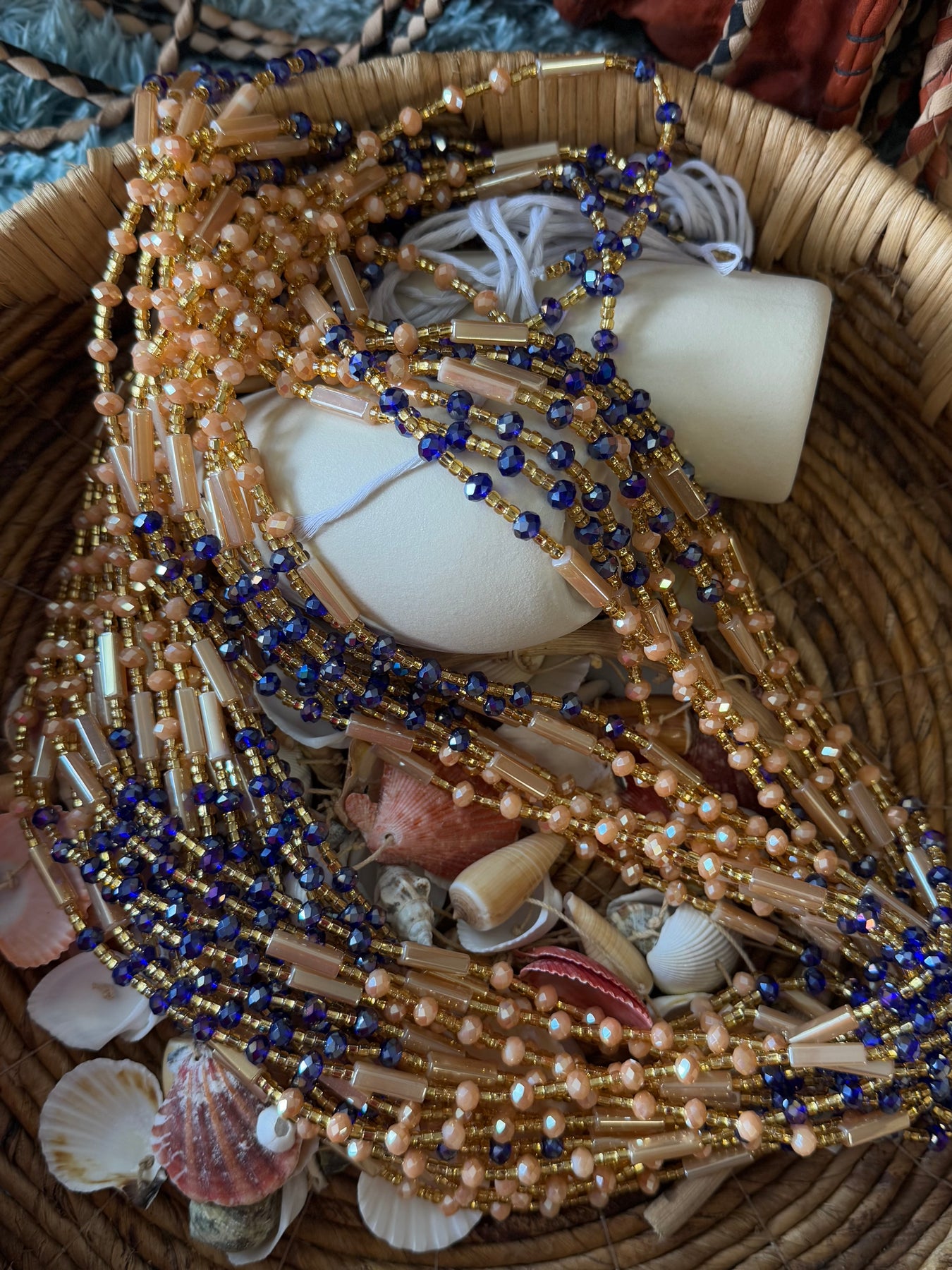 These waist beads are beautifully made with cotton string and glass crystal beads. They are tie-on waist beads that are adjustable at the length of 50-55inches long.
